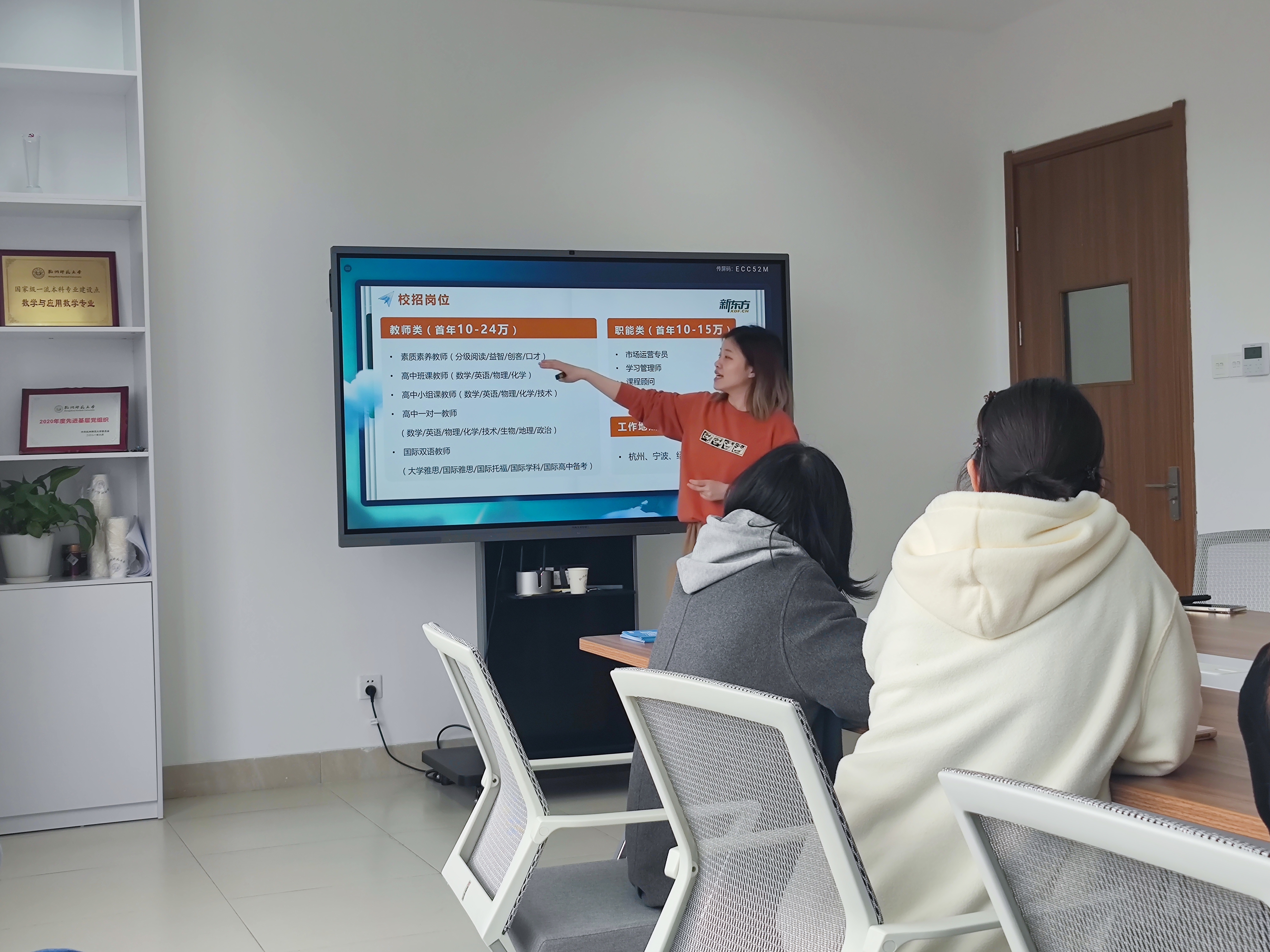 王晓敏先结合自身的求职、入职、从教经历进行了分享活动。在求职环节,她从笔试、面试、磨课、终试等环节进行了详细的讲解。在从教经历环节,她从备课、教学计划安排,以及教学团队氛围等进行分享。冯丹琦浙江新东方的基本情况、招聘岗位流程和要求、培训方式、晋升渠道和空间、薪资待遇等多个方面全方位的介绍了新东方的招聘情况。