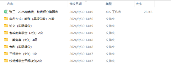 符合条件的学生本人于10月7日前向班长提交申请材料。申请时提交《2025届省优、校优积分换算表》以及相关佐证材料,材料按图中所示,将以上材料汇总为一个总文件夹,个人材料命名为“学号-姓名”,班级总文件夹命名为“班级-优秀毕业生”,并以班级为单位汇总发送至邮箱20210174@rbseqing.net,不接收个人为单位发送的材料。