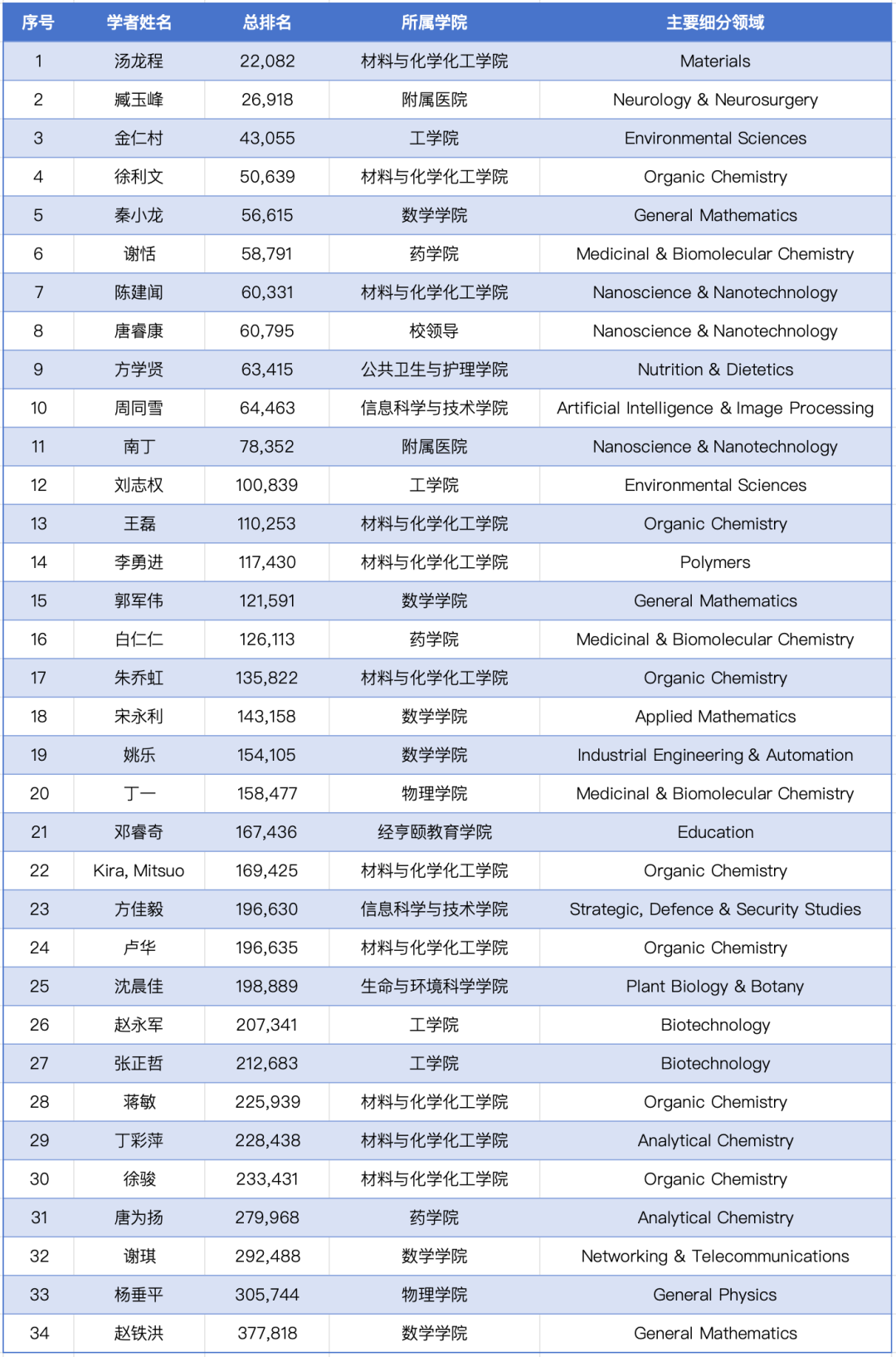 我校34位学者入选全球前2%“年度科学影响力榜单”