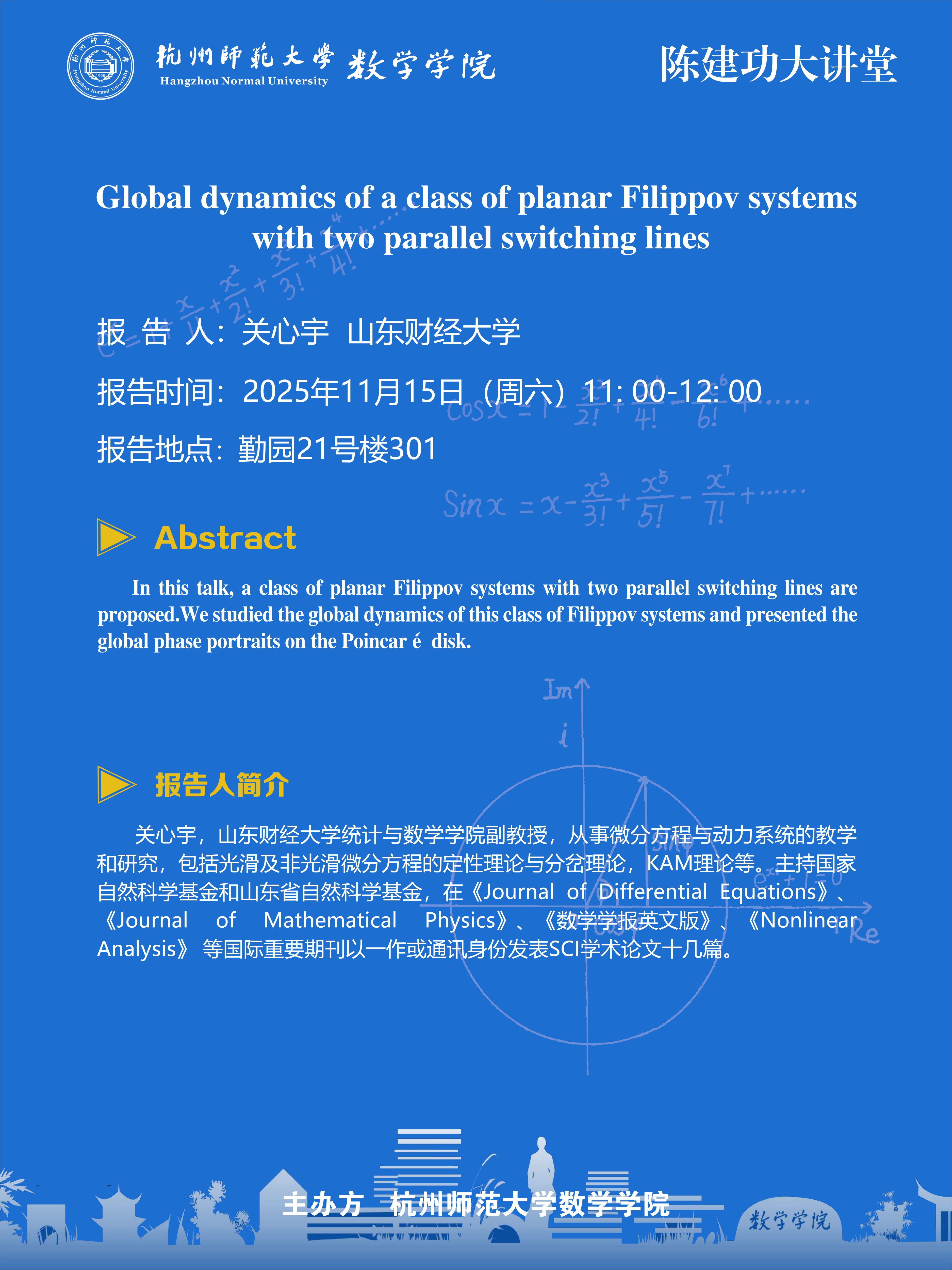 陈建功大讲堂(2025-130):Global dynamics of a class of planar Filippov systems with two parallel switching lines