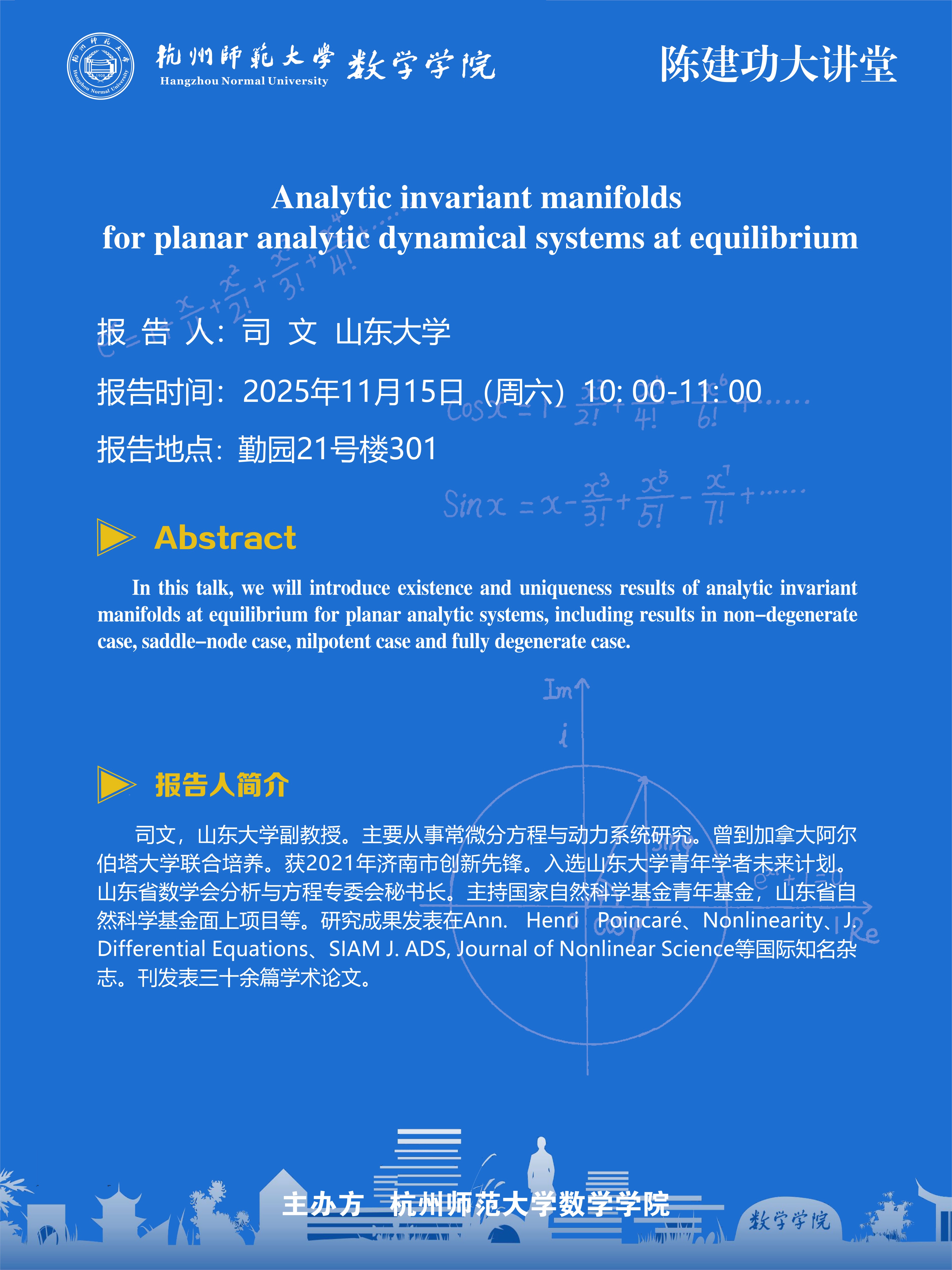 陈建功大讲堂(2025-131):Analytic invariant manifolds for planar analytic dynamical systems at equilibrium