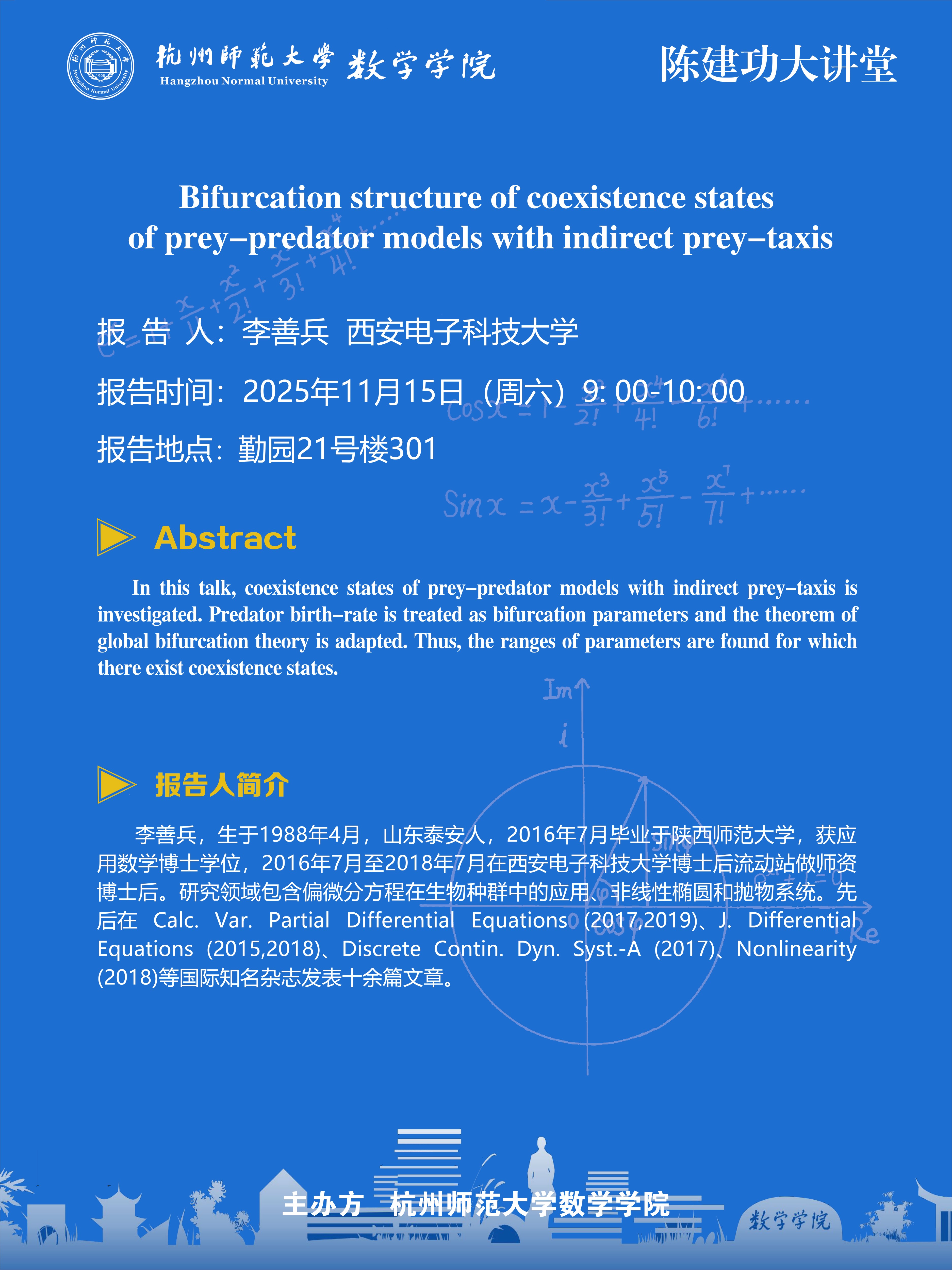 陈建功大讲堂(2025-132):Bifurcation structure of coexistence states of prey-predator models with indirect prey-taxis