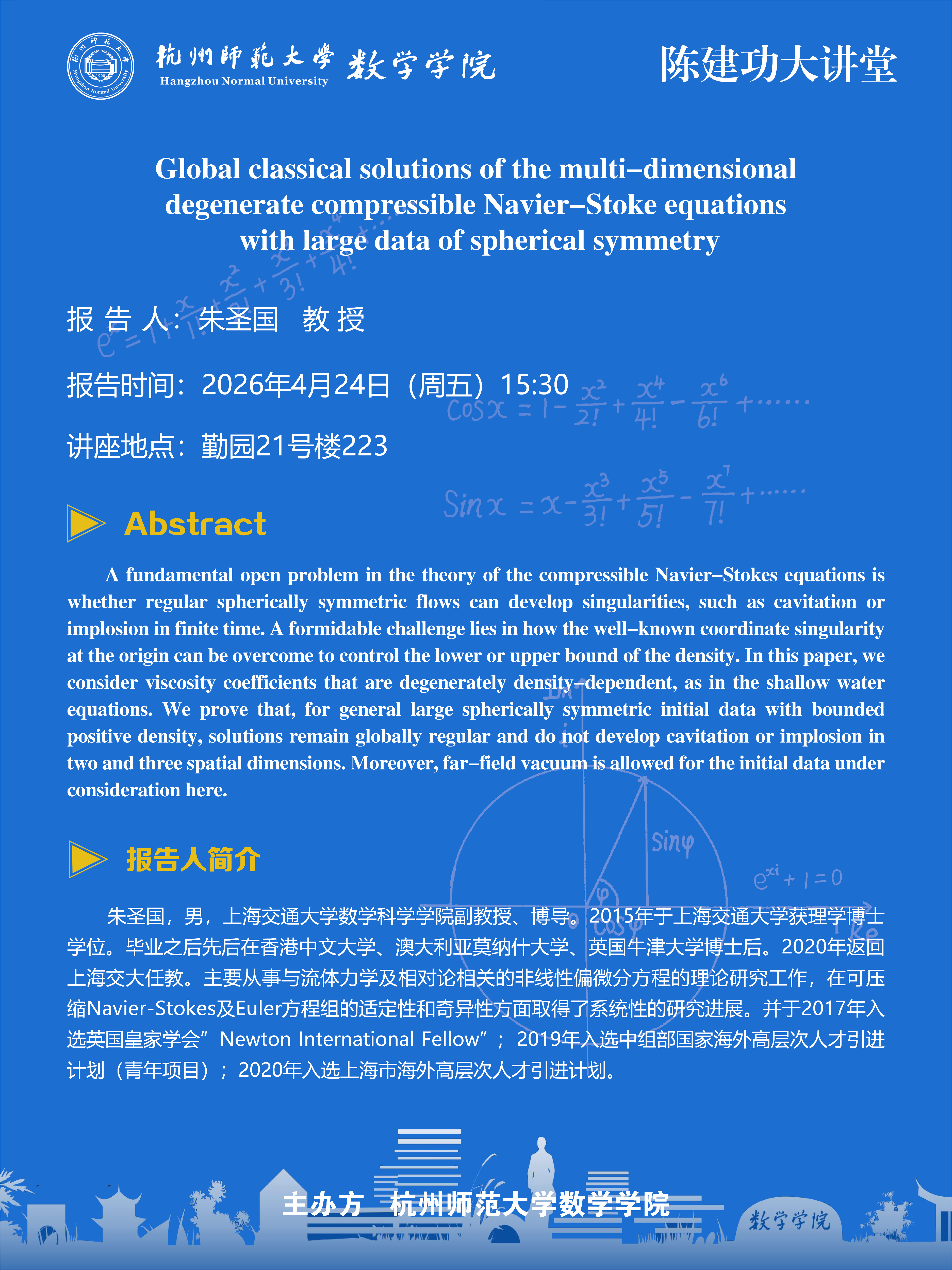 陈建功大讲堂(2026-14):Global classical solutions of the multi-dimensional degenerate compressible Navier-Stoke equations with large data of spherical symmetry